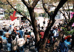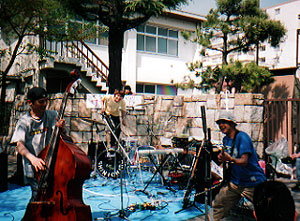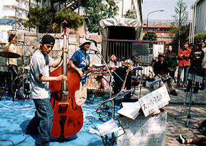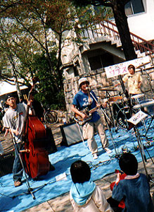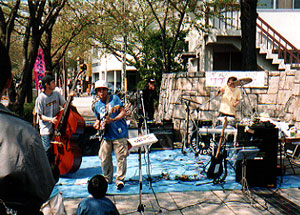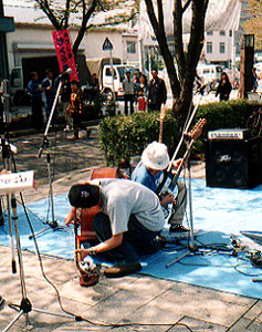 APR.7 ★ 2002 ///立石さくらまつり/// 前日から雨だったが、演奏が始まる頃には天気が回復。 しかし今年は桜の開花が早く、御覧の通り「葉桜」。花見ができなくて、ちと残念。 まぁ、演奏楽しめたからいいんだけどよ。